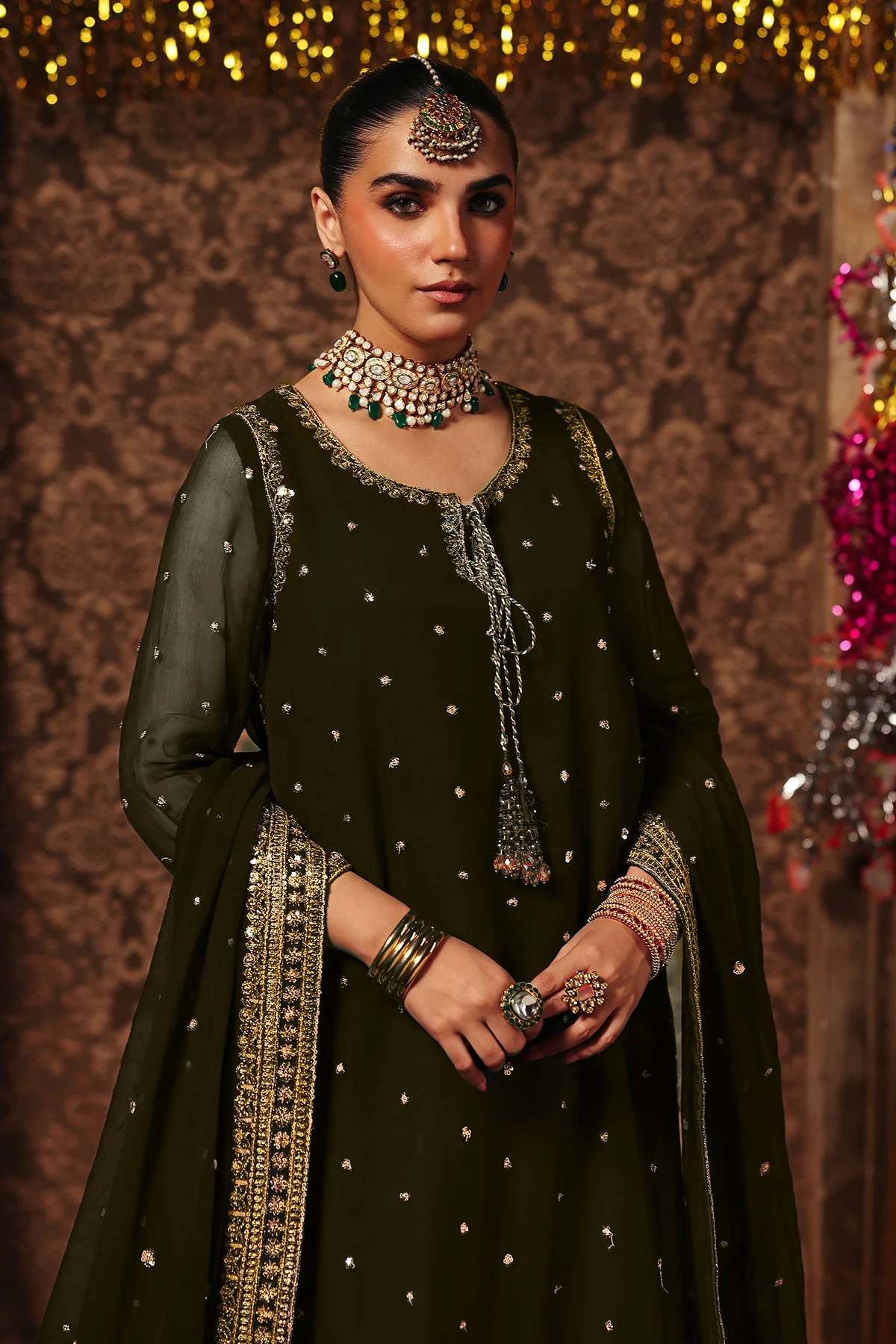 Paired with a heavily adorned dupatta bordered with rich embroidery and a matching flared Dhaka pajama with heavy embroidered sequin and tilla border.