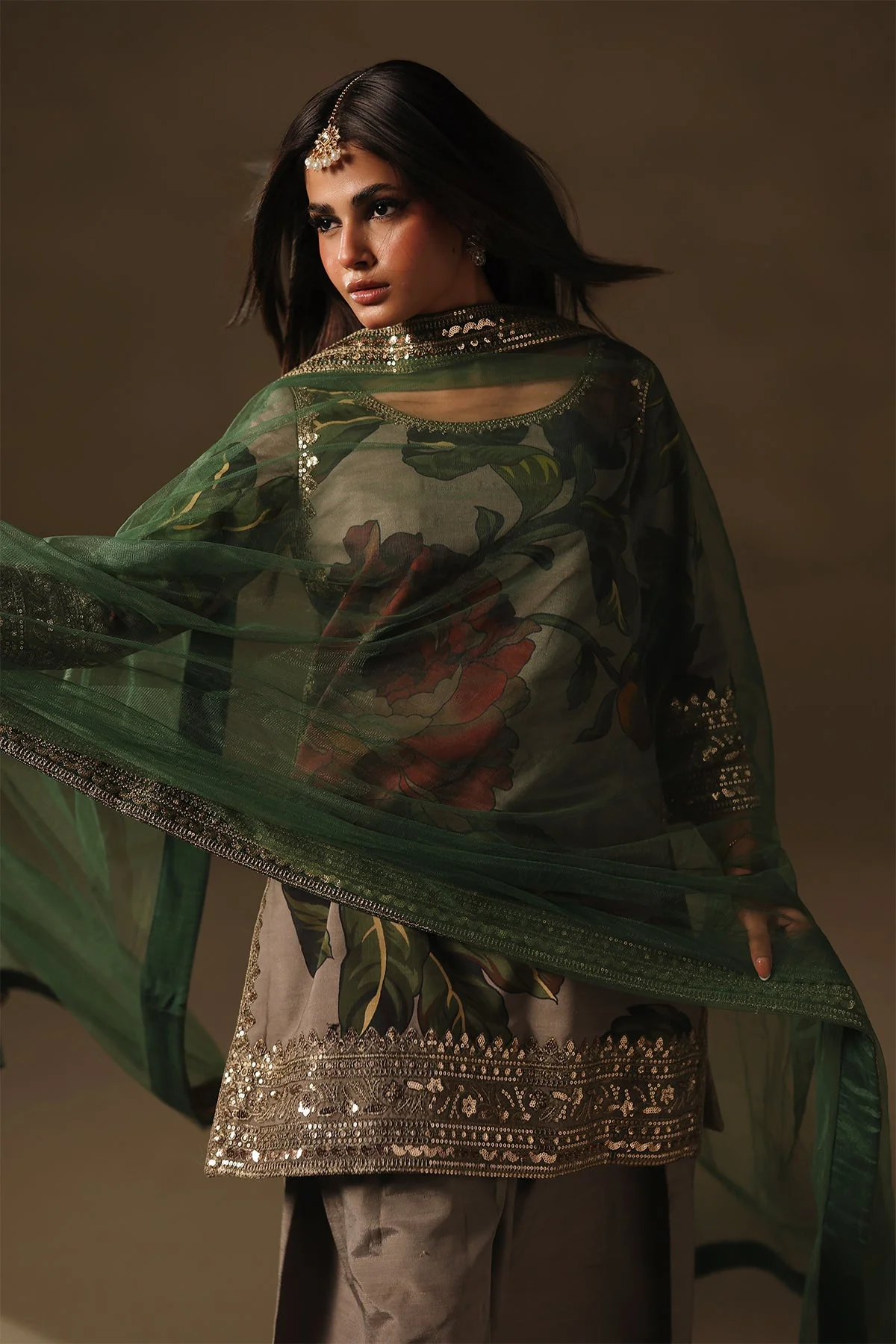 Designed on a cool neutral base, the shirt showcases oversized floral motifs in deep crimson and moss green, elevated with shimmering tilla-worked hems and delicately embellished sleeves.